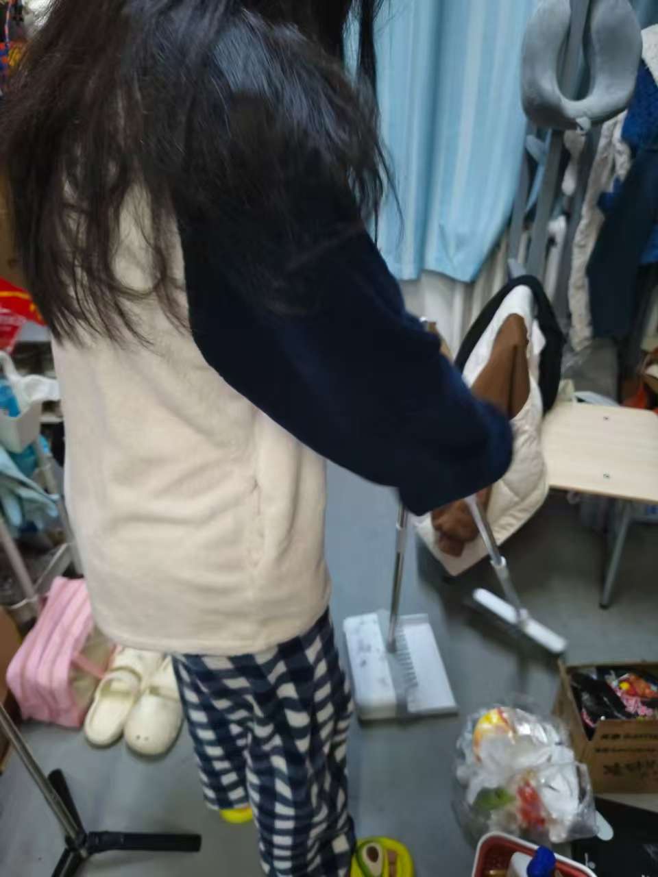 “地面清洁组”的成员们则是宿舍环境的“美容师”。他们手持扫帚、拖把等工具,向卫生死角发起总攻。从床铺与地面的狭窄缝隙,到阳台容易积灰的边角,每一处都不曾被遗忘。连散落的零食碎屑、细微的头发丝都被彻底清除。汗水挥洒间,原本蒙尘、发灰的地面逐渐恢复了本色,最终变得光可鉴人,映照出同学们忙碌而满足的笑脸,也折射出认真对待生活的态度。