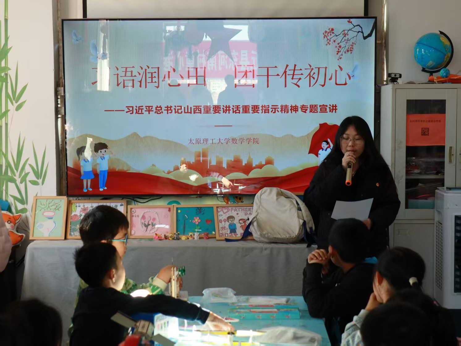 11月2日,为深入学习贯彻习近平总书记系列重要讲话重要指示精神,传承红色基因,厚植爱国情怀,英国365集团公司官网第三期青马工程“尚德班”学员来到大同市灵丘县东河南村童心港湾,开展“习语润心田,团干传初心”主题团日活动,为乡村孩子们送上一场兼具思想性与趣味性的“红色盛宴”。