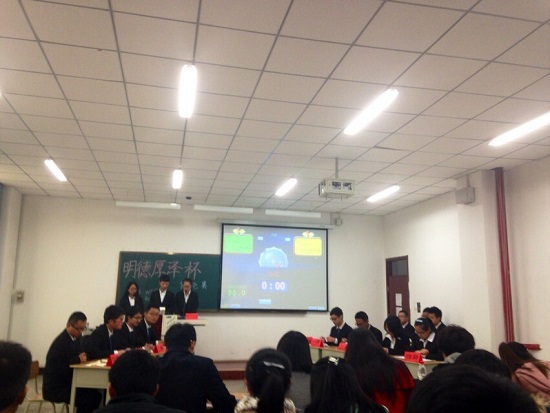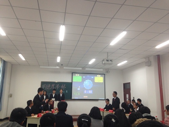比赛开始,双方以比较幽默的开场方式介绍了自己的队伍;之后双方就自己所执观点展开辩论。台上选手个个信心十足,比赛过程激动人心,各支队伍的辩手配合默契,妙语连珠,当仁不让。他们旁征博引,将整个比赛带入一个又一个高潮。在自由辩论环节,双方队员都拿出了各自实力,将整场辩论赛的气氛推向高潮。在总结陈词环节,双方四辩就对方逻辑上的漏洞进行一一回击,思路清晰,引经据典,才思敏捷。