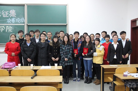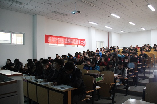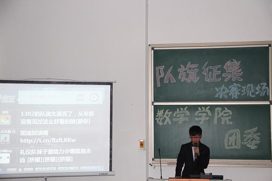 经过初赛公众投票的激烈角逐,初赛评委从28副参赛作品中遴选出10副优秀作品进行最后的决赛,本次决赛由队旗设计理念的PPT宣讲、微博互动以及现场亲友团拉票等环节组成。下午2点30分,荣鑫老师为本次大赛致辞,宣布本次大赛的开始,随后各组参赛队伍依次上台展示并讲解自己的作品以及进行亲友团拉票,现场评委相应地对参赛的作品进行点评。活动过程中还有微博互动环节,从参加微博互动的现场观众中随机抽取两位并赠送精美礼品,使得活动现场气氛十足。参赛作品的最终得分由现场评委评分及微信投票得分共同组成,最终由统计1302班李宝平、侯晋红、石倩男同学共同设计的“数奉旗”荣获第一名。