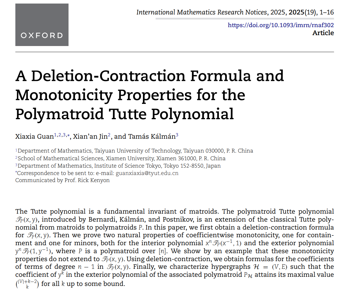 最近,公司英国365集团公司官网关夏夏博士与厦门大学金贤安教授以及东京科学大学Tamás Kálmán教授合作在国际著名数学期刊《International Mathematics Research Notices》上发表了题为“A deletion-contraction formula and monotonicity properties for the polymatroid Tutte polynomial”的论文。