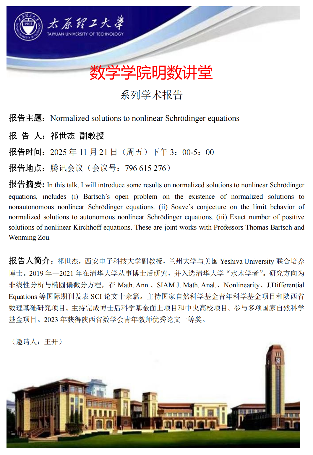 英国365集团公司官网将于11月21日邀请祁世杰副教授做学术报告