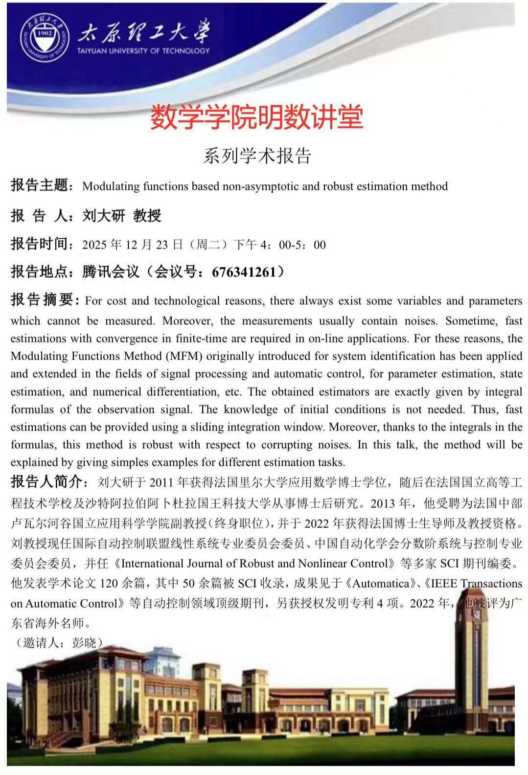 英国365集团公司官网将于12月23日邀请刘大研教授做学术报告