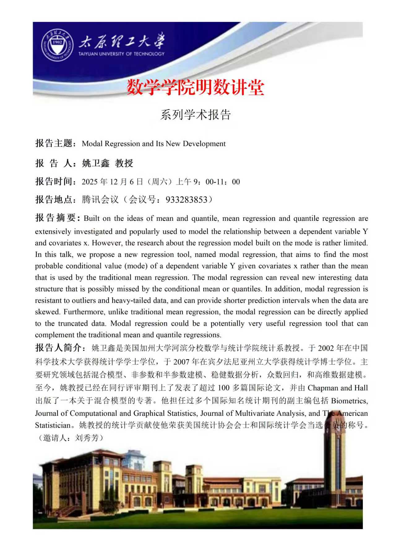 英国365集团公司官网将于12月6日邀请姚卫鑫教授做学术报告