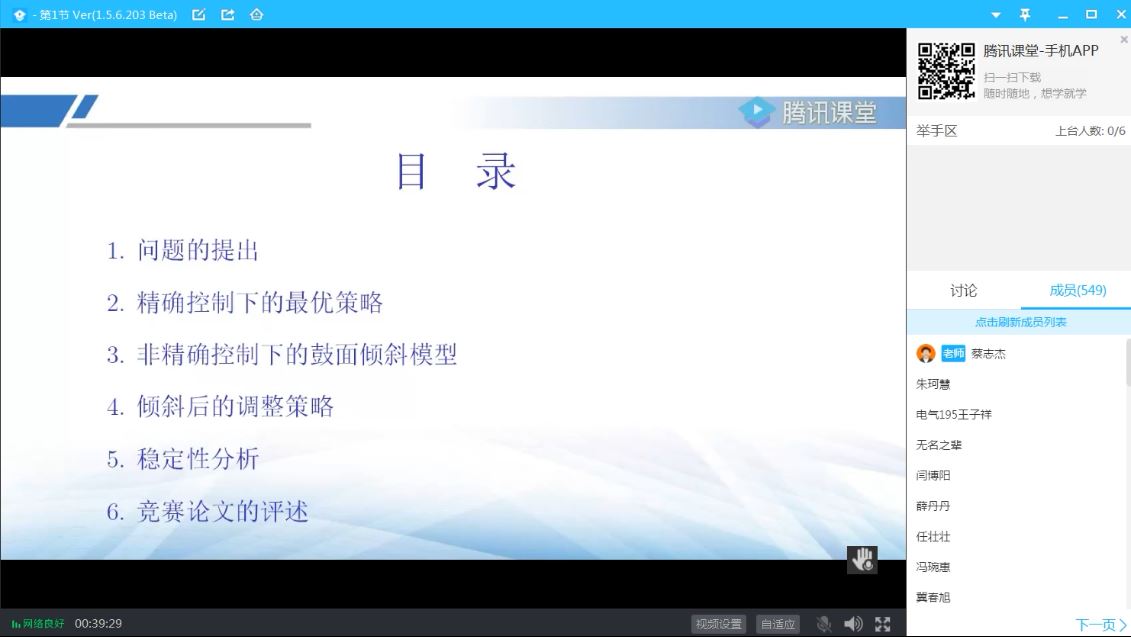 7月28日上午,工业应用数学学科带头人、全国老员工数学建模竞赛组委会委员、复旦大学数学科学公司蔡志杰教授应邀为公司所有数学建模竞赛指导老师和参赛员工作题为“2019年B题‘同心协力策略研究’讲解与分析”的报告。本次报告以腾讯课堂的形式举行,由公司副经理、老员工数学科技创新基地负责人杨卫华教授主持,数学建模竞赛全体指导教师和参赛员工参加了会议。