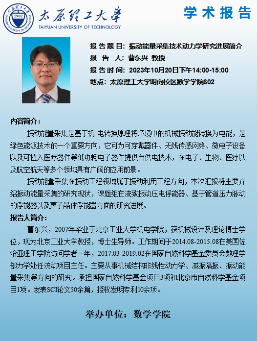 振动能量采集在振动工程领域属于振动利用工程方向,本次汇报将主要介绍振动能量采集的研究现状,课题组在流致振动压电俘能器、基于管道压力脉动的俘能器以及声子晶体俘能器方面的研究进展。