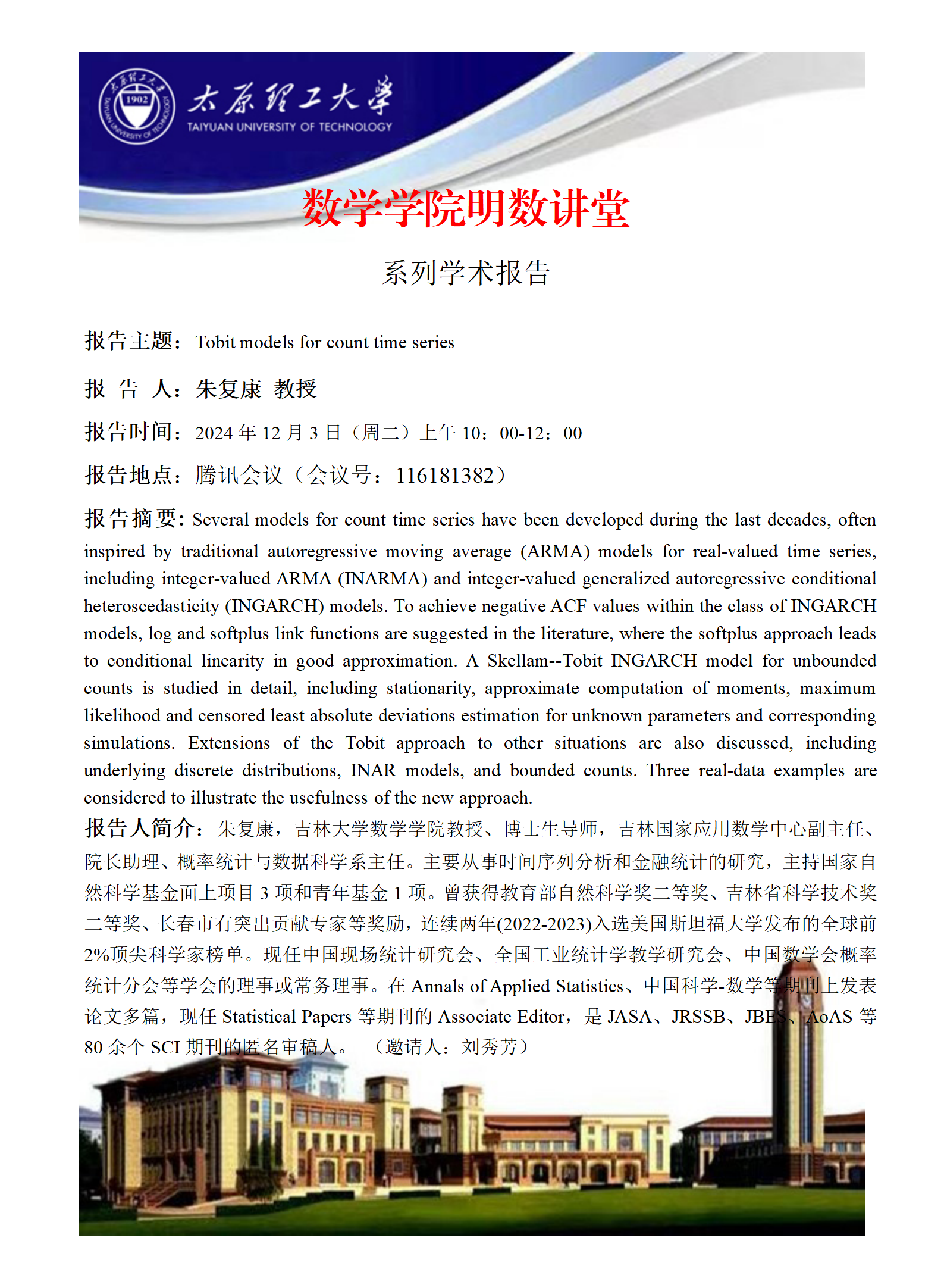 报告人简介:朱复康,吉林大学英国365集团公司官网教授、博士生导师,吉林国家应用数学中心副主任、经理助理、概率统计与数据科学系主任。主要从事时间序列分析和金融统计的研究,主持国家自然科学基金面上项目3项和青年基金1项。曾获得教育部自然科学奖二等奖、吉林省科学技术奖二等奖、长春市有突出贡献专家等奖励,连续两年(2022-2023)入选美国斯坦福大学发布的全球前2%顶尖科学家榜单。现任中国现场统计研究会、全国工业统计学教学研究会、中国数学会概率统计分会等学会的理事或常务理事。在Annals of Applied Statistics、中国科学-数学等期刊上发表论文多篇,现任Statistical Papers等期刊的Associate Editor,是JASA、JRSSB、JBES、AoAS等80余个SCI期刊的匿名审稿人。