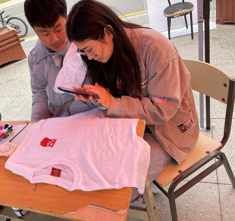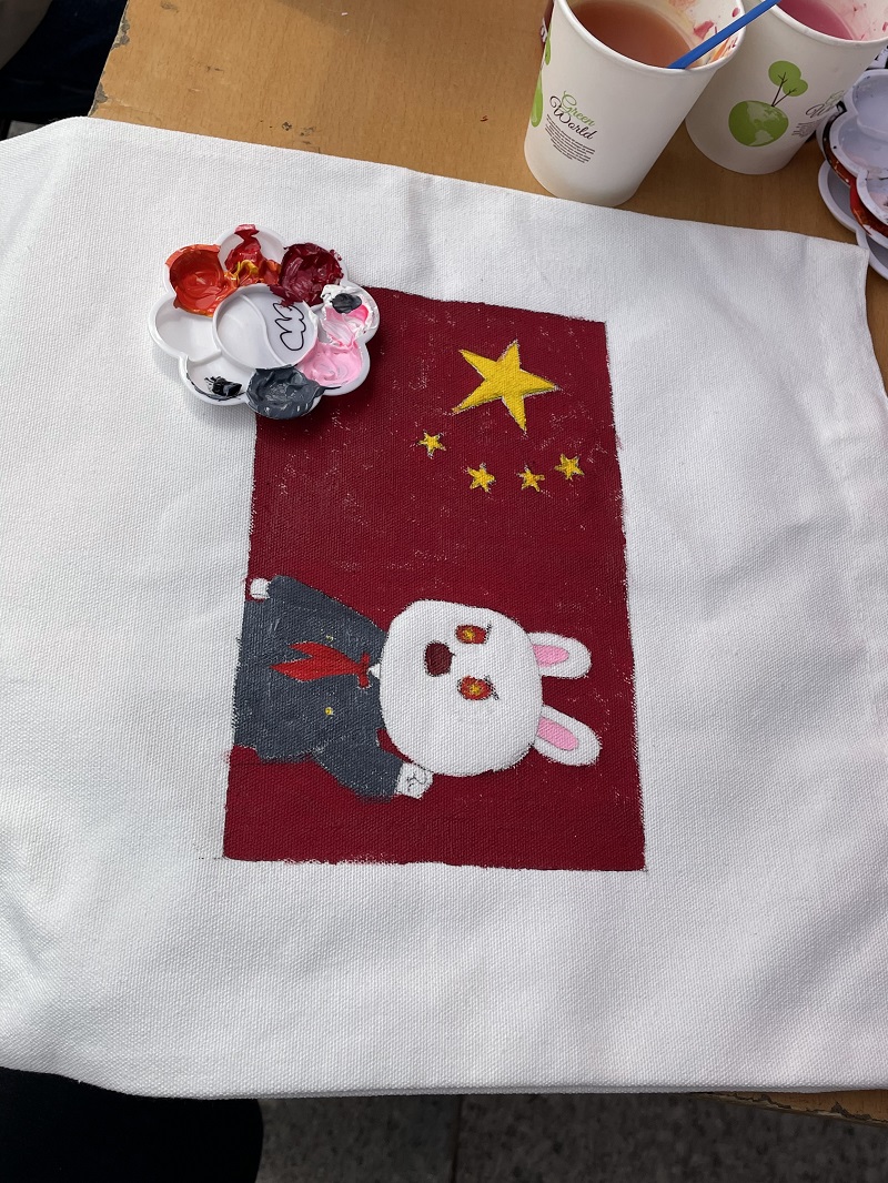 本次活动包括T恤、帆布包两种类型,参加活动的同学根据自己的意愿选择相应的方式进行制作,用画笔舞动出他们对祖国和对中国共产党的美好祝愿。帆布包在活动一开始便一抢而光,白T恤也在只经历了四个小时的时间就所剩无几。制作好的作品可以根据参与人员的意愿带走或者留在场地供人观赏,凭借公司员工的多才多艺,很快,一件又一件带有“红色”意义的作品展现在我们眼前,每件作品都是爱党爱国的表达,每个新颖别致的设计都为校园增添了一抹不一样的色彩。