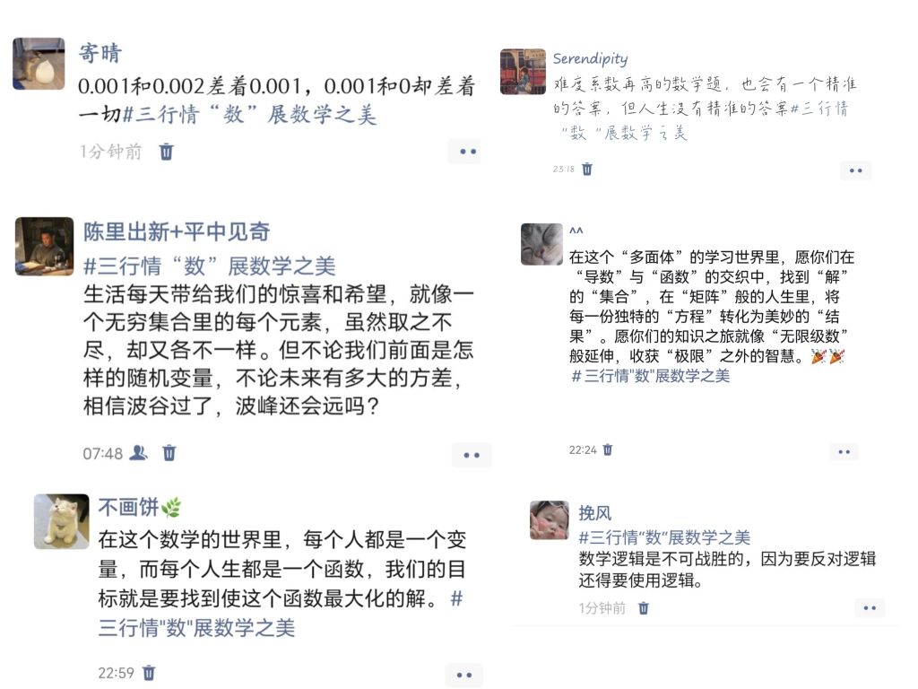 本次活动首先以线上朋友圈打卡拉开序幕,其形式和内容都非常丰富,同学们用自己的数学细胞与文学发生碰撞,一句句一段段“三行情‘数’”点燃了同学们融合数学与文学的热情,唱出了理科学子心中的万丈豪情。