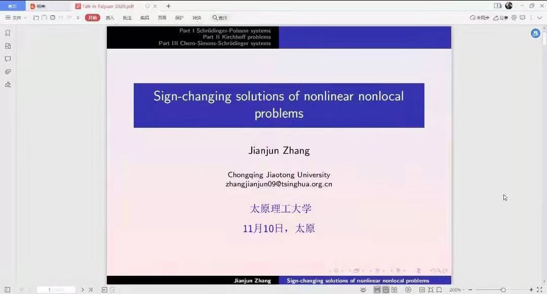 11月10日下午,公司邀请重庆交通大学张建军教授通过腾讯会议作了题为“Sign-changing solutions of nonlinear nonlocal problems”的学术报告,报告会由滕凯民教授主持,公司部分教师和研究生线上参与此次报告会。